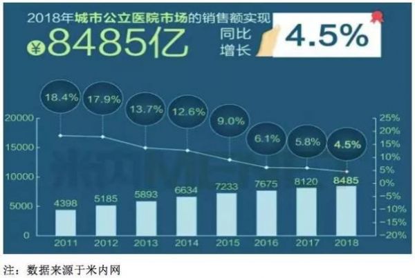 在所有市场中,占比最大的是第一终端的城市公立医院终端市场,接近50%(地级市及以上城市的二、三级医院终端),2018年占比为49.53%,2018年销售额为8485亿元,同比增速比全国终端市场还要低近2个百分点,低至4.5%。