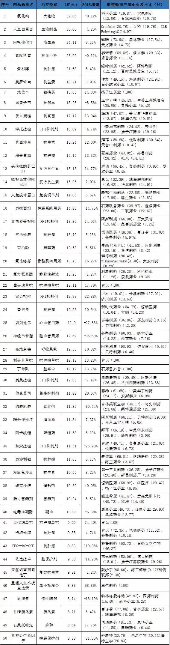 前50大品种分化加剧,临床价值高的品种保持快速增长,而在临床上被滥用、属于辅助用药、临床价值不高的品种销售额出现下滑。