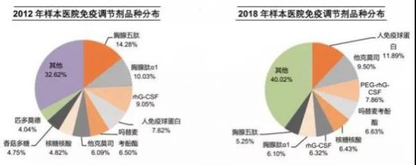 通过2012年和2018年免疫调节剂是在主要品种份额对比来看,销售额前列中胸腺五肽、胸腺肽a1、核糖核酸、香菇多糖、匹多莫德等临床用量大、辅助作用的药品占比较2018年下降明显,取而代之的是人免疫球蛋白、他克莫司、PEG-rhG-CSF等临床效果确切的药品,结构明显优化。