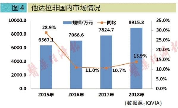 2019年1月15日,江西青峰药业拉考沙胺片获上市批准,该药用于成人及青少年(16~18岁)癫痫患者伴有或不伴有继发性全面性发作的部分性发作的联合治疗。 4、他达拉非-长春海悦 获批时间:2019年2月1日 2018年国内销售额:8915万元 他达拉非,商品名为希爱力(Cialis),由礼来研发,在国际上销售已达十多年,目前已占据ED市场龙头位置。2017年,他达拉非全球销售额高达24.46亿元。在欧美市场的PDE5抑制剂中,他达拉非的市场占有率排位第一,市场潜力巨大。