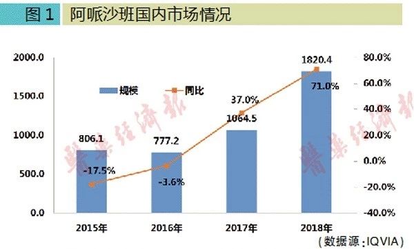 此次江苏豪森药业在众多国产企业中抢占首仿位置,于2019年1月9日获上市批准,待艾乐妥过专利期后,阿哌沙班市场可期。根据全国百床以上医院数据库统计,2018年阿哌沙班国内销售额为1820万元,同比增长71%,同比增幅呈逐年上升趋势。