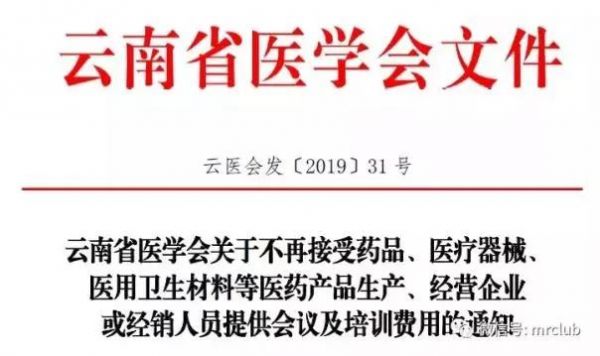 据“医药代表“微信公众号消息,日前,云南省医学会发布《关于不再接受药品、医疗器械、医用卫生材料等医药产品生产、经营企业或经销人员提供会议及培训费用的通知》,自今年4月16日起开始执行。