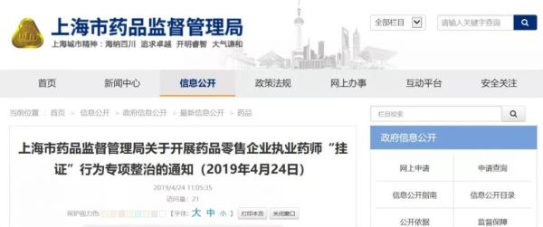 上海市药品监督管理局关于开展药品零售企业执业药师“挂证”行为专项整治的通知(2019年4月24日)