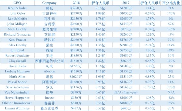 名单列出了20名大型上市制药公司CEO的薪酬榜单。