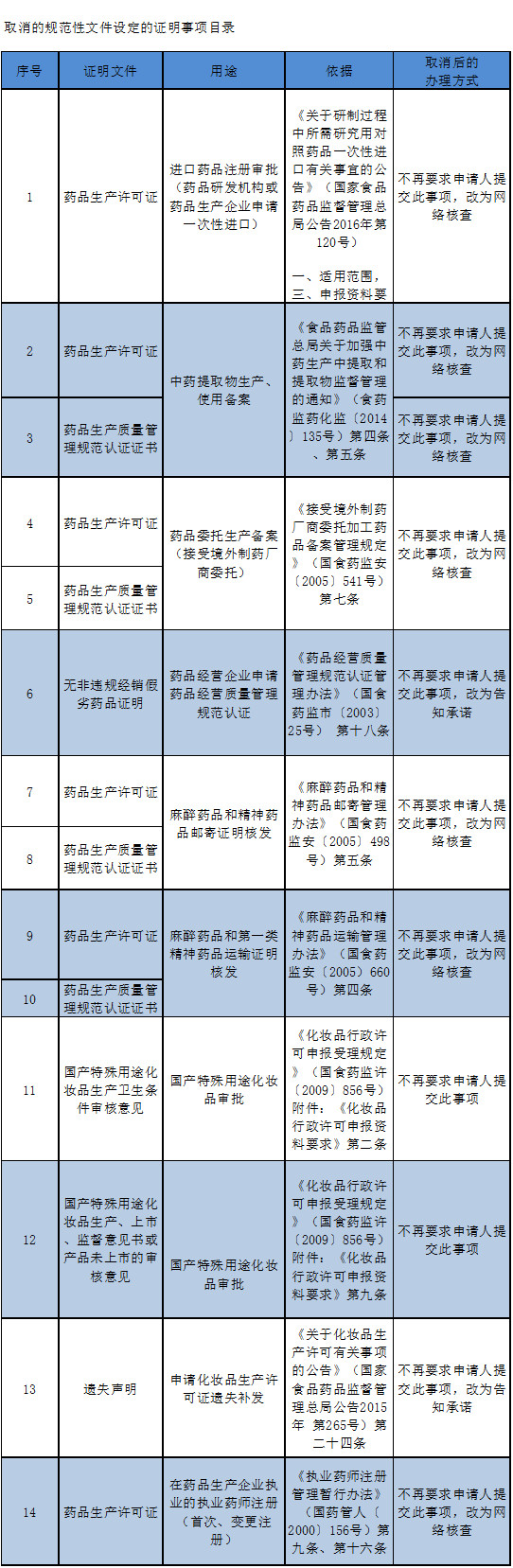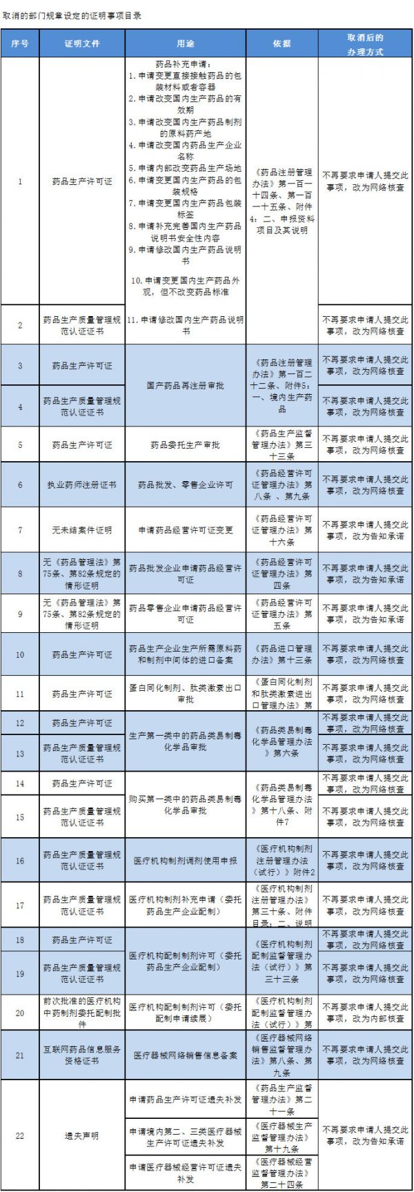 36项证明事项包括14项“规范性文件设定的证明事项”和24项“部门规章设定的证明事项”。很多事项,不再要求申请人提交此,改为网络核查。涉及到药品生产许可证、执业药师注册证书等诸多方面。
