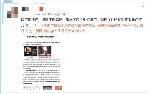 4月22日,也有微博网友爆料:博鳌亚洲骗局,银丰医院注射假疫苗,现在对受害者无任何交代。