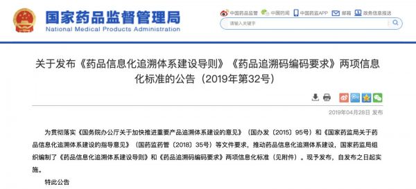 像是某种信号,就在海南假疫苗事件舆论爆发的几天后,4月28日,国家药监局官网关于发布《药品信息化追溯体系建设导则》《药品追溯码编码要求》两项信息化标准的公告(2019年第32号)。