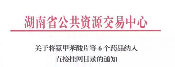 近日,湖南省公共资源交易中心发布《关于将氨甲苯酸片等6个药品纳入直接挂网目录的通知》,有6个药品被纳入直接挂网目录。