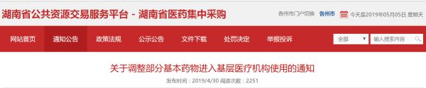 5月5日,湖南省医药集中采购平台发布《关于调整部分基本药物进入基层医疗机构使用的通知》(以下简称《通知》)。