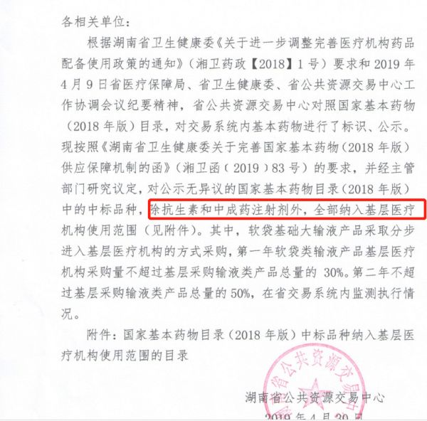 现按照《湖南省卫生健康委关于完善国家基本药物(2018年版)供应保障机制的函》(湘卫函(2019)83号)的要求,并经主管部门研究议定,对公示无异议的国家基本药物目录(2018年版)中的中标品种,除抗生素和中成药注射剂外,全部纳入基层医疗机构使用范围。