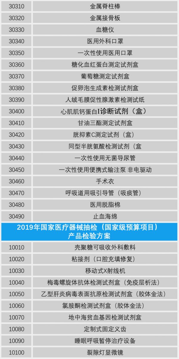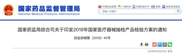 5月6日,国家药品监督管理局官网发布《国家药监局综合司关于印发2019年国家医疗器械抽检产品检验方案的通知》(下称《通知》),向各省、自治区、直辖市药品监督管理局印发2019年国家医疗器械抽检产品检验方案。