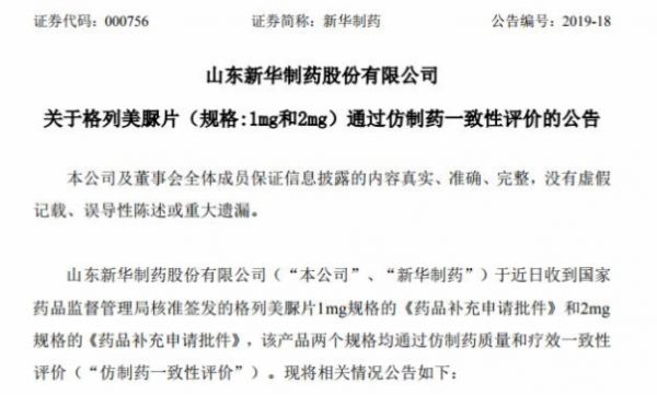 5月15日,山东新华制药公告称,于近日收到国家药监局核准签发的格列美脲片1mg规格的《药品补充申请批件》和2mg规格的《药品补充申请批件》,该产品两个规格均通过仿制药质量和疗效一致性评价。