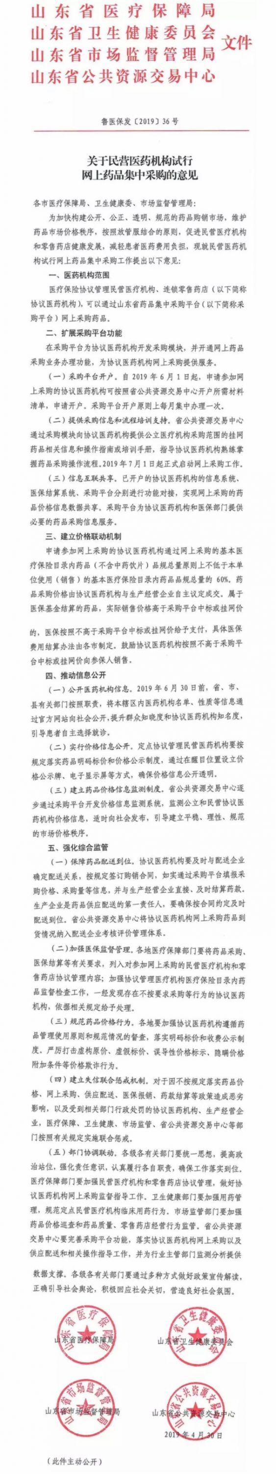 5月15日,山东省药品集中采购网发布《关于民营医药机构试行网上药品集中采购的意见》,通知要求医疗保险协议管理的民营医疗机构、连锁零售药店,可以通过山东省药品集中采购平台网上采购药品,同时,对于属于医保基金结算的药品,实际销售价格高于采购平台中标或挂网价的,医保将按照不高于采购平台中标和挂网价给予支付!