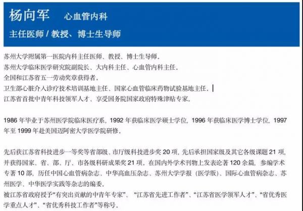 从官网给出的资料上看,杨向军是心脏介入手术治疗专家、江苏省的医学领军人才、博士生导师、全国江苏省五一劳动奖章获得者,享受国务院特殊津贴。