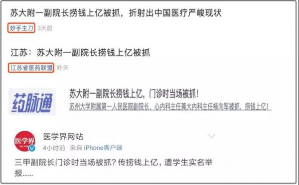近日,医学界网站和江苏省医药联盟微信公众号均发文指出,苏州大学附属第一人民医院副院长、心内科主任杨向军,5月1日在门诊被抓。因被其博士生实名举报,装一个回扣一万元。
