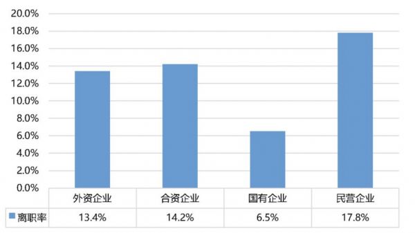 平均工资的高低对离职率也会有一定的影响,报告对不同性质的企业主动离职率进行分析后发现,民营企业的员工主动离职率最高,达17.8%,合资企业次之,为14.2%,最低为国有企业,主动离职率仅为6.5%。