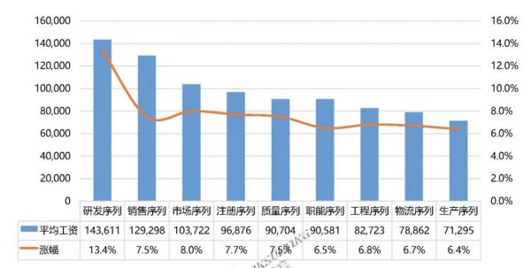 报告显示,在2018年企业序列平均工资及薪酬涨幅中,研发岗员工的平均工资和涨幅最高,分别为143611元和13.4%,销售岗和市场岗员工的平均工资次之,为129298元和103722元,涨幅为7.5%和8%。