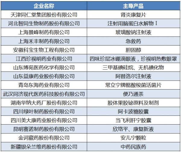 经梳理,此次名单上共有天津同仁堂、四川绿叶等16家药企,既有中药企业,也有化学原料药、制剂企业,涉及的产品包括肾炎康复片、注射用脑蛋白水解物Ⅰ、阿卡波糖胶囊等。