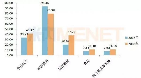 图2:2017-2018年康美药业主要业务板块的营收情况(单位:亿元)