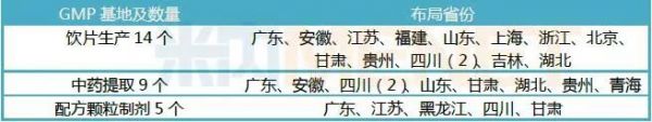 2018年,中国中药以中药饮片和中药配方颗粒为核心,统一规划开展产业布局。通过江阴天江药业、广东一方制药牵头,按照各自的省份规划,在邻近地道药材产地,通过收购兼并与自建增资并举的模式,快速占领战略位置,在15个省(市)建设中药饮片和配方颗粒基地。 表2:中国中药已建成的GMP基地