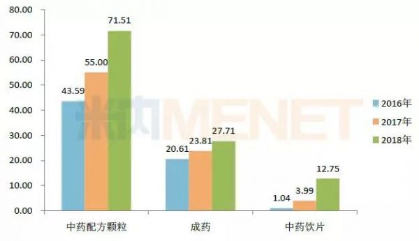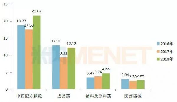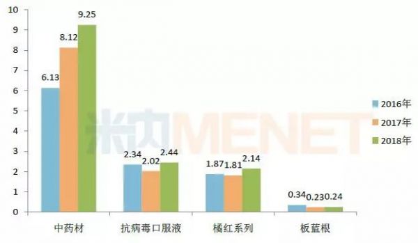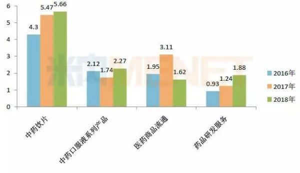 图1:2016-2018年中国中药主要业务板块的营收情况(单位:亿元)