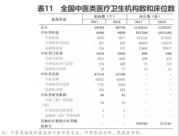 《公报》显示,2018年末,全国中医类医疗卫生机构总数达60738个,比上年增加6495个。其中:中医类医院4939个,中医类门诊部、诊所55757个,中医类研究机构42个。与上年比较,中医类医院增加373个,中医类门诊部及诊所增加6125个。