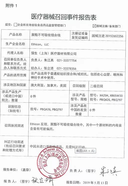 4、强生(上海)医疗器材有限公司报告,由于涉及产品可能存在原材料内毒素含量有可能偏高的问题,生产商Ethicon, LLC对聚酯不可吸收缝合线(注册证编号:国械注进20152652256)主动召回。召回级别为二级。涉及产品的型号、规格及批次等详细信息见《医疗器械召回事件报告表》。