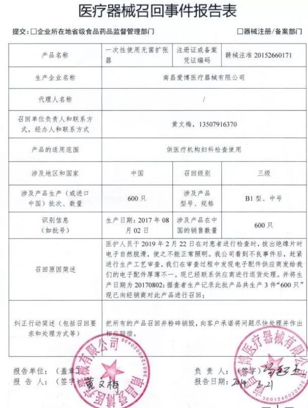 5、南昌爱博医疗器械有限公司报告,由于电子配件厚薄不一等原因,南昌爱博医疗器械有限公司对其生产的一次性使用无菌阴道扩张器(注册号:赣械注准20152660171号)主动召回。召回级别为三级。涉及产品的型号、规格及批次等详细信息见《医疗器械召回事件报告表》。