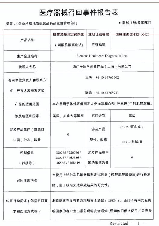 1、西门子医学诊断产品(上海)有限公司报告,由于涉及产品存在校准失败的问题,生产商Siemens Healthcare Diagnostics Inc.对肌酸激酶测定试剂盒(磷酸肌酸底物法)(注册证编号:国械注进20182400427)主动召回。召回级别为三级。涉及产品的型号、规格及批次等详细信息见《医疗器械召回事件报告表》。