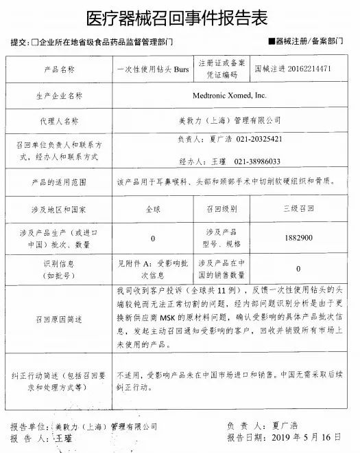 3、美敦力(上海)管理有限公司报告,由于涉及产品存在头端较钝而无法正常切割的问题,生产商Medtronic Xomed, Inc.对一次性使用钻头Burs(国械注进20162214471)主动召回。召回级别为三级。涉及产品的型号、规格及批次等详细信息见《医疗器械召回事件报告表》。