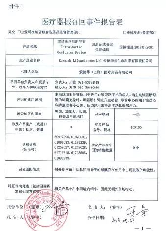 2、爱德华(上海)医疗用品有限公司报告,由于涉及产品可能存在部分批次产品导管球囊使用中出现破裂可能的问题,生产商Edwards Lifesciences LLC对主动脉内阻断导管Intra-Aortic Occlusion Device(注册证编号:国械注进20183132601)主动召回。召回级别为一级。涉及产品的型号、规格及批次等详细信息见《医疗器械召回事件报告表》。