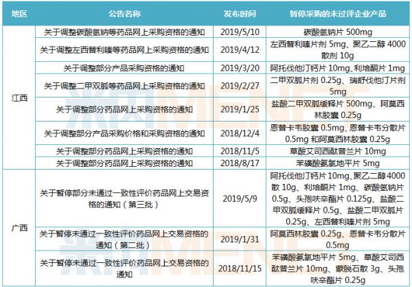 在“4+7”带量采购执行效果超预期,第二批带量采购品种即将公布的情况下,未过评与未中选产品企业在医疗机构招标采购与零售市场的销售中面临着越来越大的阻力。近期,江西、广西、江苏等多个省份的药品招采平台相继发布公告,对“未通过一致性评价,且已有其他3家企业通过一致性评价”药品生产企业暂停网上采购资格。