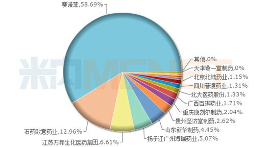 2017年中国公立医疗机构终端格列美脲销售额为36.59亿元,原研厂家赛诺菲占据58.69%的市场份额。销售TOP5企业中,扬子江药业、万邦生化、新华制药的产品均已通过一致性评价。石药欧意占据格列美脲12.96%的市场份额,但未申报该产品的一致性评价。
