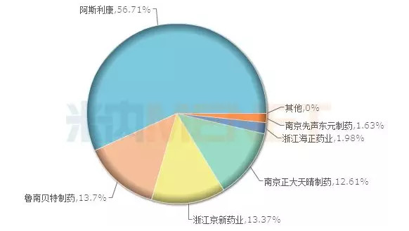 据米内网数据,2017年中国公立医疗机构终端瑞舒伐他汀片剂销售额为50.19亿元,原研厂家阿斯利康占据56.71%的市场份额,鲁南贝特制药占比13.70%,京新药业占比13.37%。近年来,阿斯利康该产品的市场份额从2013年的69.64%下滑至2017年的56.71%。目前,瑞舒伐他汀钙片通过一致性评价的企业已达6家,分别为鲁南贝特制药、海正药业、先声东元制药、南京正大天晴、京新药业、诺华Lek。