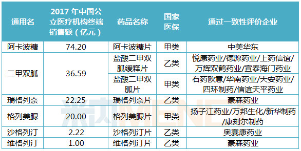值得关注的是,第一批25个“4+7”品种中,没有糖尿病用药品种被纳入集采。据米内网数据,目前糖尿病用药通过一致性评价的通用名品种有6个。其中,阿卡波糖、二甲双胍、瑞格列奈、格列美脲等4个品种2017年在中国公立医疗机构终端销售额均超过20亿元,是糖尿病患者的主要用药品种。可以预见,糖尿病用药将是第二轮带量采购的重点。