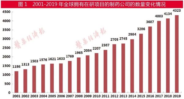 全球拥有在研药物项目的药企数量,近年来一直呈现增长态势,从2001年的1198家增至2019年的4323家。2019年全球药企数量较2018年增加189家,增幅达4.6%,与2018年3.3%的增幅相比,呈现小幅回升,但与2015-2017年间8%以上增幅比仍有差距。