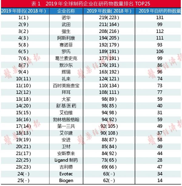 从2019年数据来看,排名居前五位的制药公司分别为诺华、武田、强生、阿斯利康、赛诺菲,在研药物数量分别为219个、211个、208个、194个和192个。