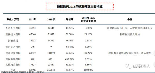 从恒瑞2018年研发开支构成来看,占比最高的项目是临床设计试验费用及直接投入费用,分别占研发提升总额的48.34%和30.7%。另外,薪酬增长率为19.54%的同时股权激励费用增长率为692.29%,说明恒瑞着重使用股权激励策略调动核心员工积极性。这样的研发投入结构也能看出恒瑞医药坚持自主研发模式为主。