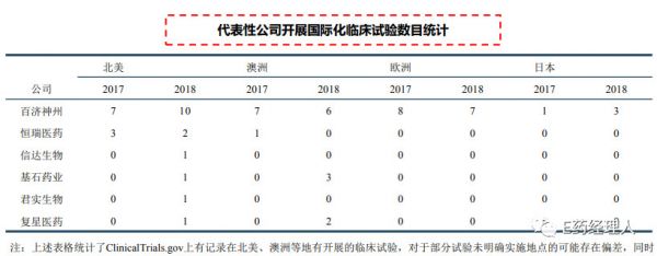 值得注意的是,百济神州高研发投入背后隐含的是国际化战略。根据中信建投统计,近两年百济神州在海外开展临床试验数目增长最多,2018年在北美开展了10个临床试验,同时在澳洲、欧洲、日本均有开展多中心临床。临床试验数目远远领先于恒瑞医药、信达生物、君实生物。这也不难理解百济神州高额的研发投入增长,因为北美、欧洲等地区的临床试验成本远比中国要高。