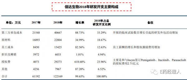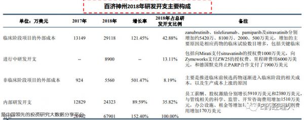 百济神州占比最高的项目是临床阶段项目的外部成本及内部研发开支费用,主要是相应药物临床试验数目增多,员工薪酬、股权激励费用增加所致。此外,与2017年相比,非临床阶段项目的外部成本曾都较大,主要是推进临床前候选药物逐渐进入临床阶段。这说明百济神州在研管线丰厚。