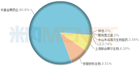 金赛药业的重组人生长激素注射液、注射用重组人生长激素和聚乙二醇重组人生长激素注射液是用于因内源性生长激素缺乏所引起的儿童生长缓慢等。据米内网数据显示,2017年在中国城市公立医院、县级公立医院、城市社区中心及乡镇卫生院(简称中国公立医疗机构)终端重组人生长激素注射剂的销售额超过25亿元,金赛药业以80%的市场份额位居首位,此外,还有安科生物、联合赛尔生物、未名海济生物医药等厂家生产。