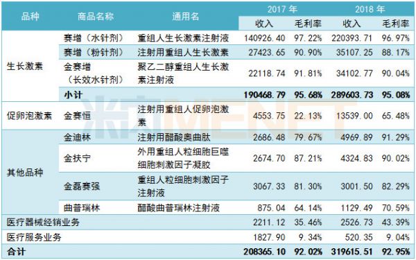 2018年金赛药业营业收入31.95亿元,同比增长53.39%;净利润11.32亿元,同比增长65.01%,毛利率超过90%。金赛药业表示,业绩增长主要是生长激素产品,较2017年增长近10亿元,增幅达52.05%,占收入比例超过90%。目前,应用于儿童生长发育领域的重组人生长激素的收入占营业收入比重较大,公司将积极研发应用于烧伤治疗、辅助生殖、消化治疗领域的产品。