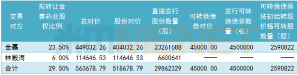 资料显示,金赛药业全部股东权益的交易价值为191.08亿元,而29.50%股权的交易作价为56.37亿元,长春高新拟以发行股份的方式支付交易对价的92.02%,即51.87亿元;以发行可转换债券的方式支付交易对价的7.98%,即4.50亿元。此次交易前,长春高新持有金赛药业70%股权,金赛药业是其控股子公司;交易完成后,长春高新持有金赛药业的股权比例将由70%增加至99.50%。