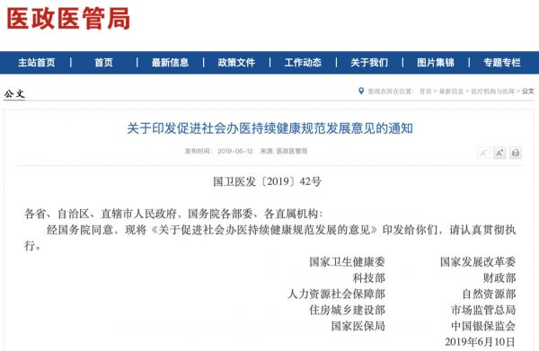 6月12日,经国务院同意,国家卫健委等十部委联合发布《关于促进社会办医持续健康规范发展的意见》。