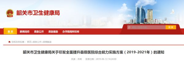 6月13日,广东省韶关市发布全面提升县级医院综合能力的实施方案(2019-2021年),计划到2020年,力争县域内住院率达到90%左右。