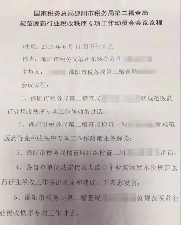 日前,行业传出《湖南省邵阳市税务局第二稽查局规范医药行业税收秩序专项工作动员会议程》。此次议程的核心内容是规范医药行业税收秩序专项工作,参加会议的还有企业代表。