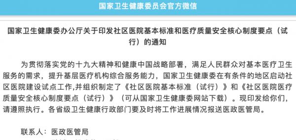 6月17日,国家卫健委在其官方微信上发布最新消息《国家卫生健康委办公厅关于印发社区医院基本标准和医疗质量安全核心制度要点(试行)的通知》。