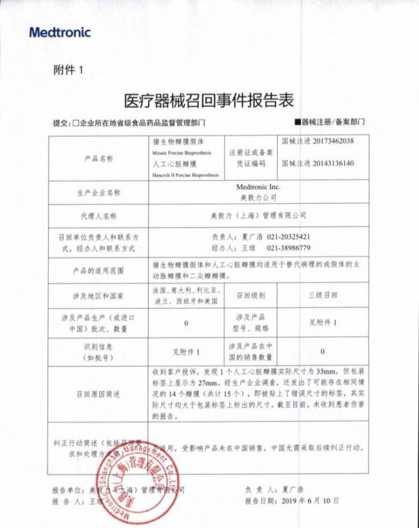 6月21日,药监局官网公布,美敦力(上海)管理有限公司报告,由于涉及产品存在包装标签尺寸与产品不符的问题,生产商Medtronic Inc.对猪生物瓣膜假体Mosaic Porcine Bioprosthesis(注册证号:国械注进20173462038)及人工心脏瓣膜Hancock II Porcine Bioprosthesis(注册证号:国械注进20143136140)主动召回。召回级别为三级。