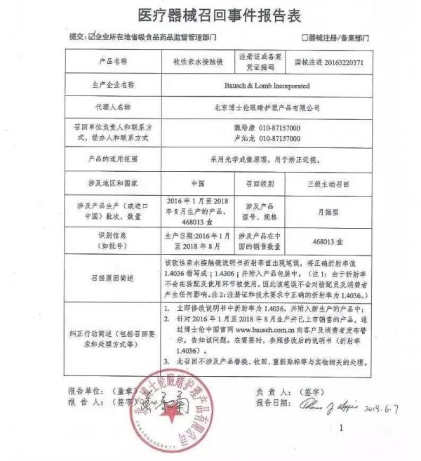 6月21日,药监局官网公布,北京博士伦眼睛护理产品有限公司报告,由于产品软性亲水接触镜说明书折射率值出现笔误,将正确折射率值“1.4036”错写成“1.4306”并附入产品包装中等原因,Bausch & Lomb Incorporated 对其生产的 软性亲水接触镜(注册或备案号:国械注进20163220371)主动召回。召回级别为三级。