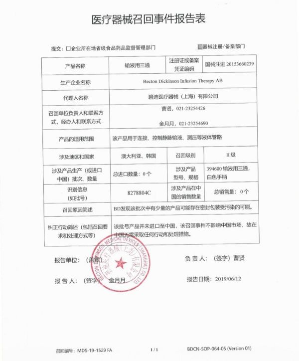 BD召回,不涉中国区进口与销售